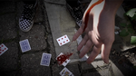 A card is selected, memorized, and lost in the pack. The magician reveals the wrong card, appearing to have failed miserably. The magician can then use a knife or the card to give himself a cut. When the blood is dripped onto the card, an eerie revelation forms in the liquid.