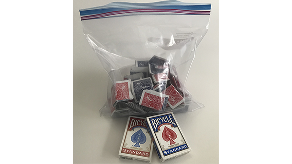 The performer now produces a gallon size Ziploc freezer bag that contains dozens of folded playing cards. The performer explains that there are two complete decks, including Jokers, contained in the bag, each card having been folded into quarters. The bag is handed out for a very thorough examination. It is found to be exactly as advertised (because it is!).