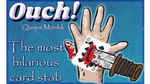 The cards are thrown, and "by accident", the magician stabs the knife in his hand, also going through the chosen card!