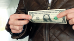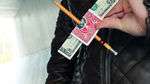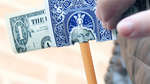 Next, you borrow a bill from your spectator, fold it in half lengthwise, and place it between the card's folds.